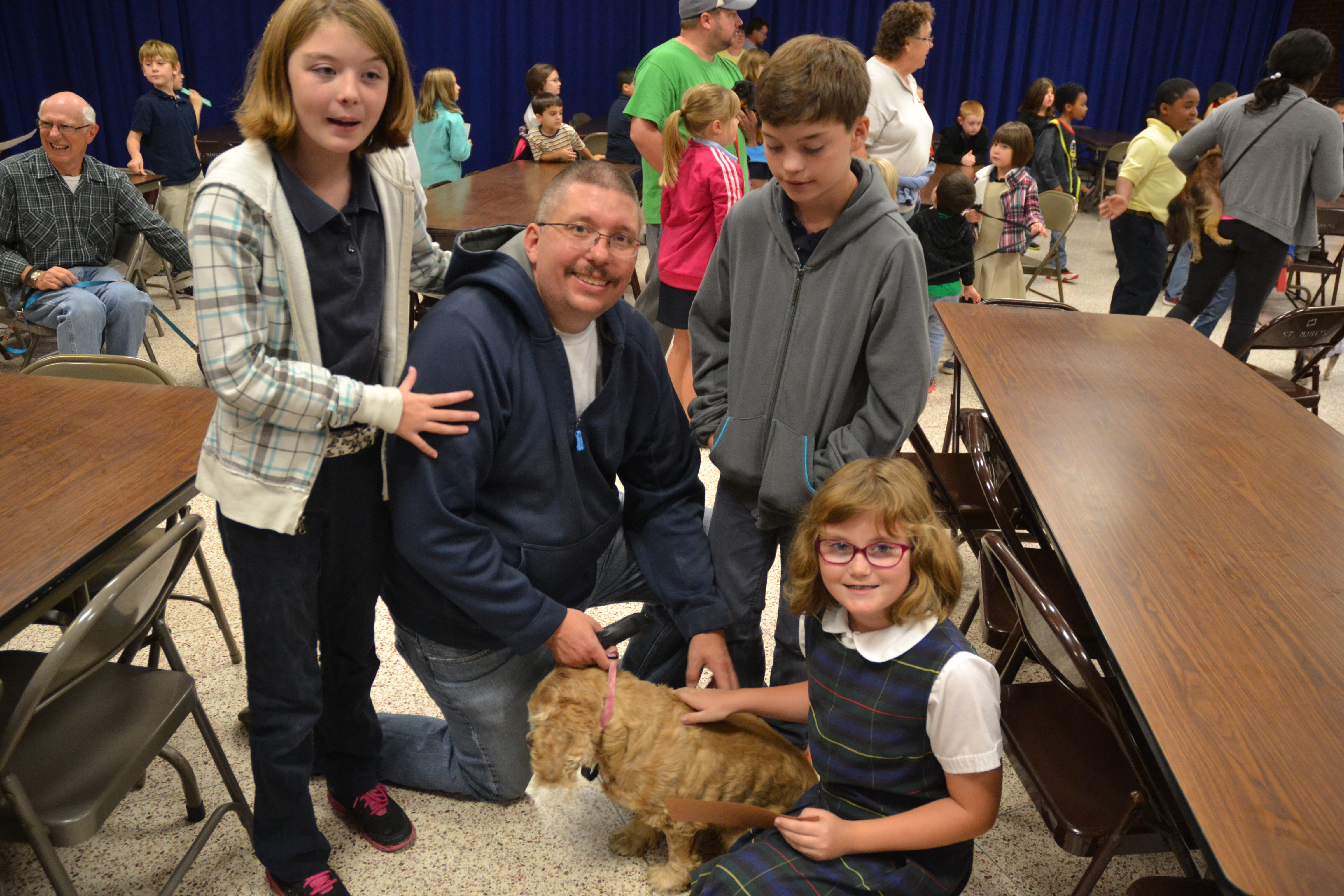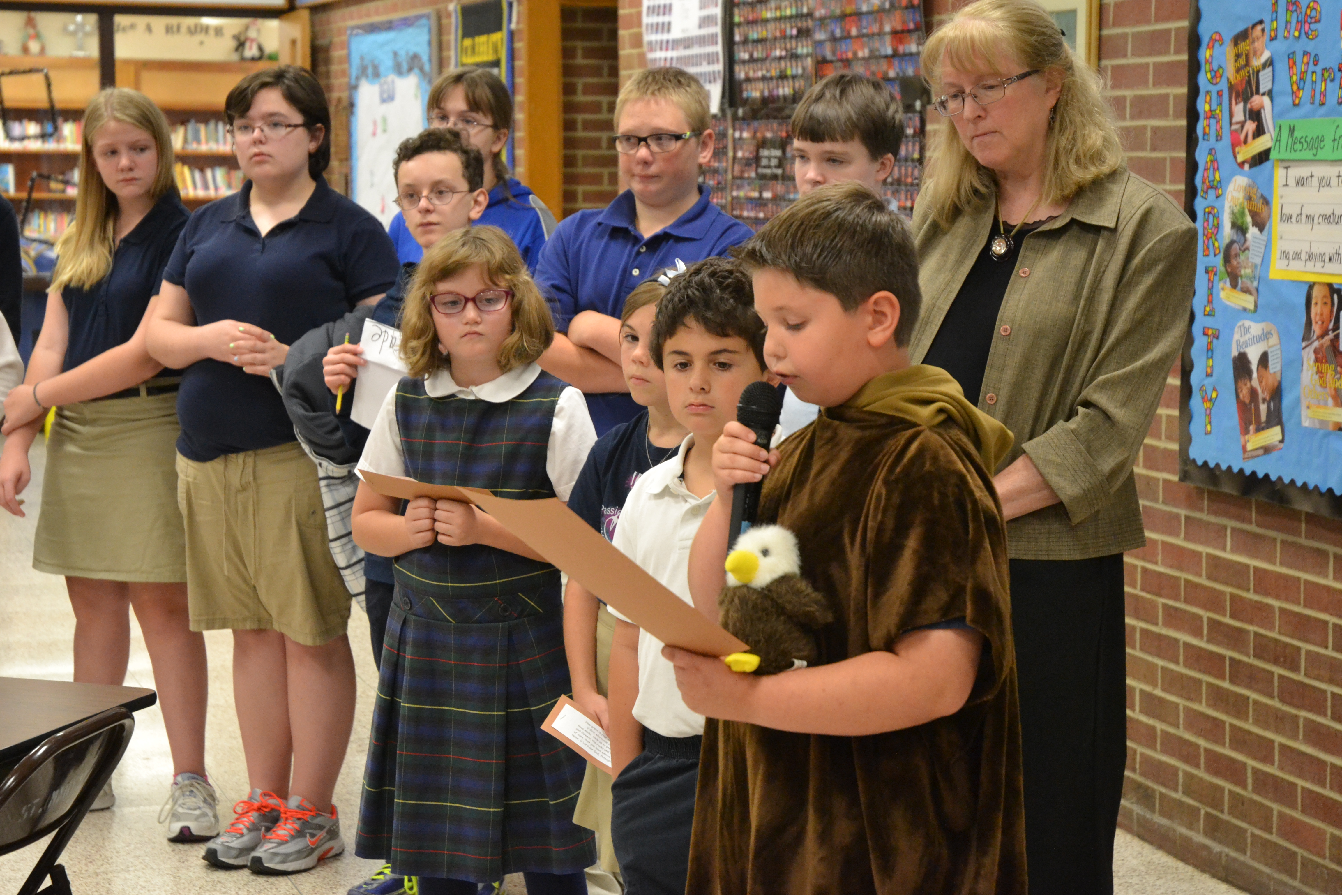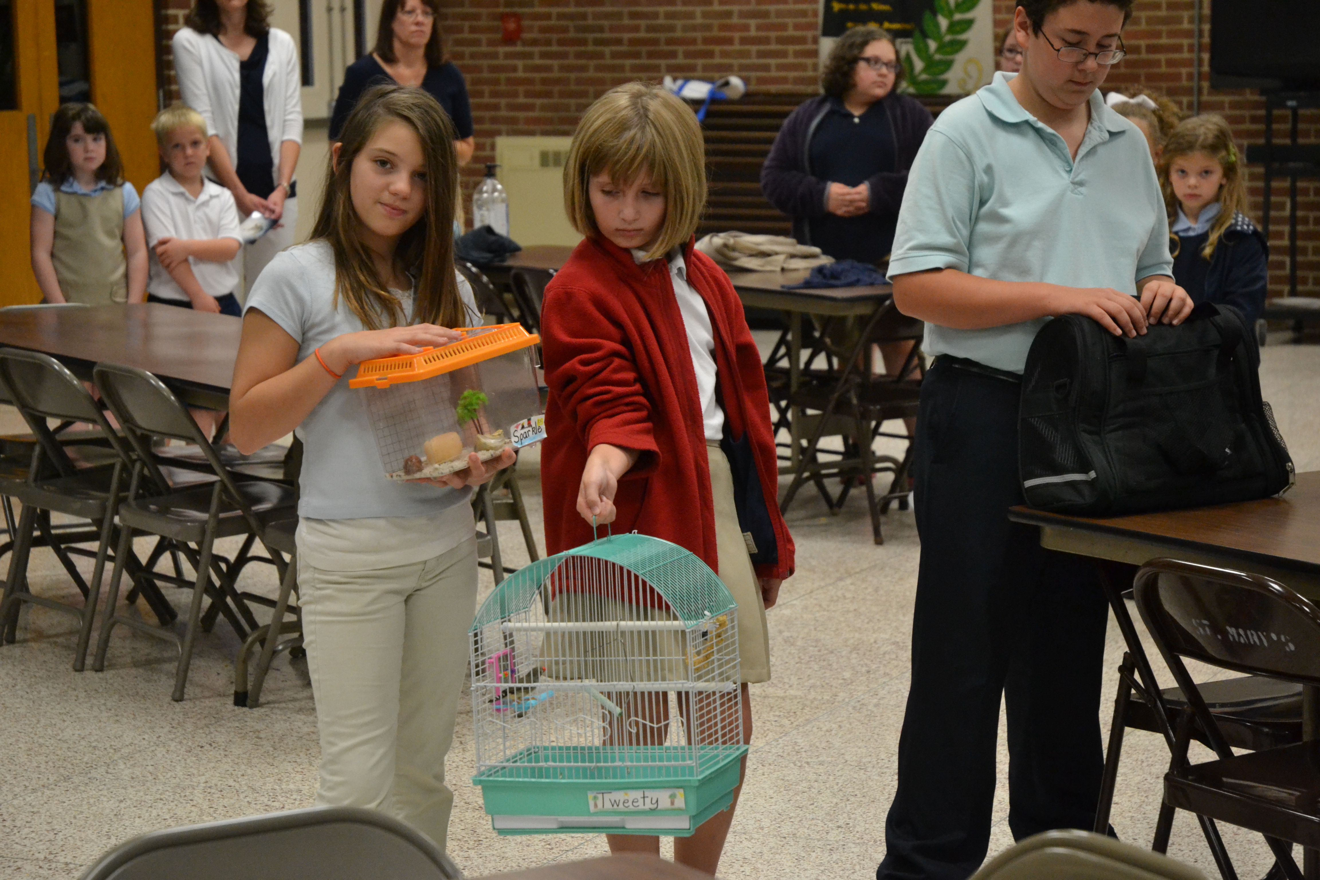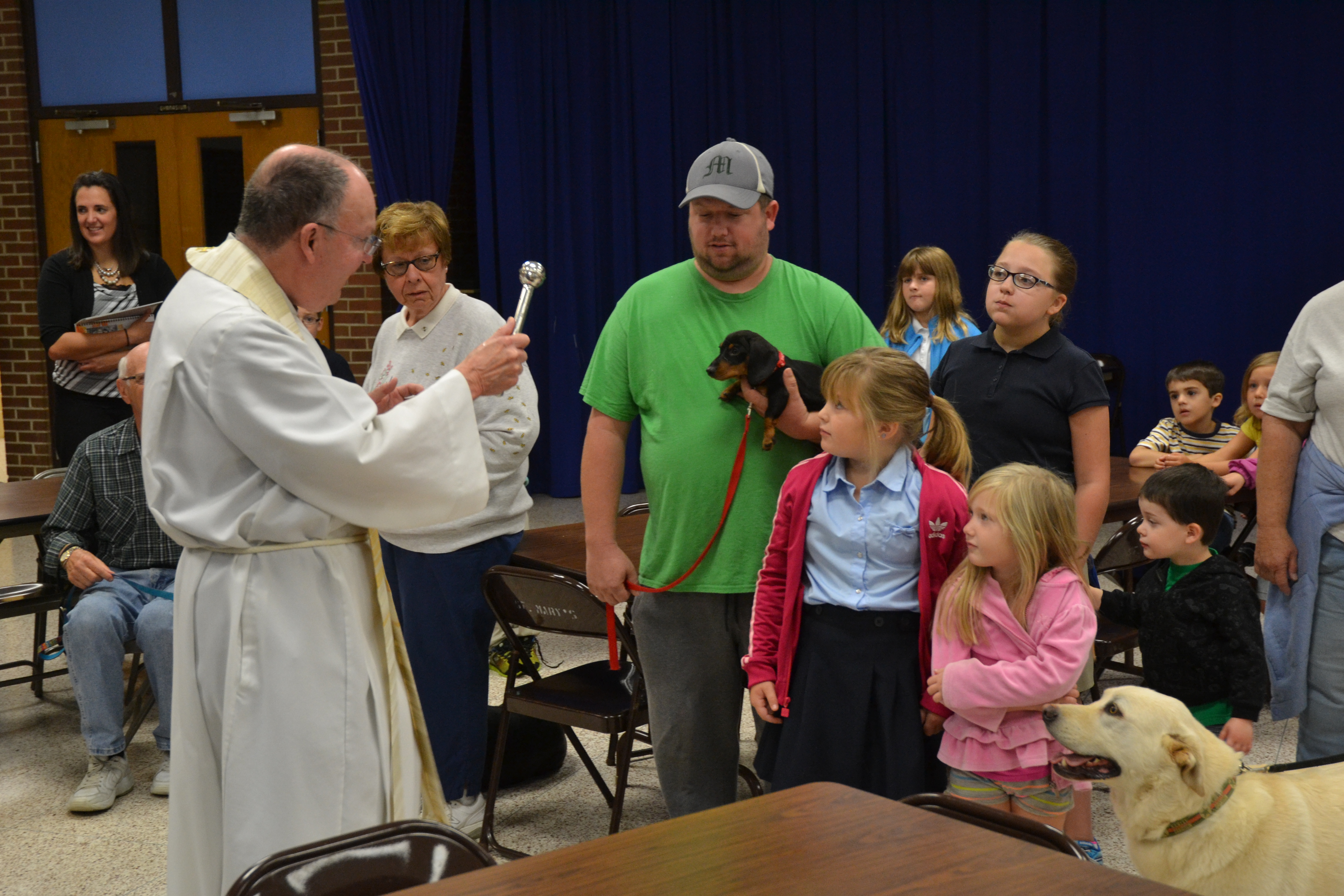 On Friday, October 3rd we had our second annual Blessing of the Pets at St. Mary’s School. After a small presentation from our third grade (and an appearance from St. Francis of Assisi), Father Beaver blessed all of the many pets who arrived in the school cafeteria. We had dogs, cats, birds and hermit crabs. We also had many pets who were not able to attend in person but were represented by a photo. All of the visitors to our school were very well behaved!