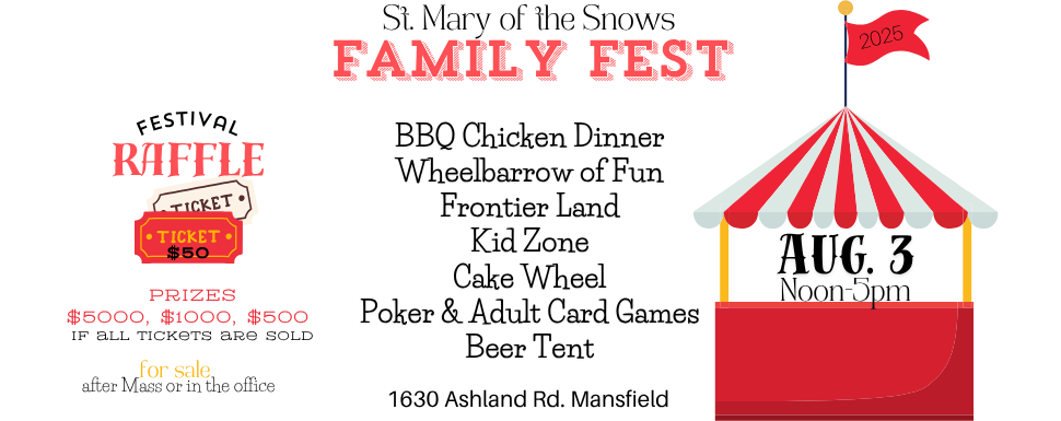 Our Parish Festival is held on Sunday at the beginning of August near the Feast of our Patron, Our Lady of the Snows. It’s a one day family event featuring a delicious chicken dinner freshly prepared on our BBQ pit. Raffle tickets are sold for cash prizes. Our kids area is filled with fun games and activities that are a hit with the little ones! Kids of all ages love to win a home-baked cake from the cake wheel! The events vary each year but some highlights of past festivals are live music, bingo, frontier land, and a car show, to name just a few. Check out the flyer below from last year’s event to see even more details of the many things that our festival has to offer. Thank you to everyone for your support and hard work to make our festival a fun and successful event each year! We would love to have you join us next time!